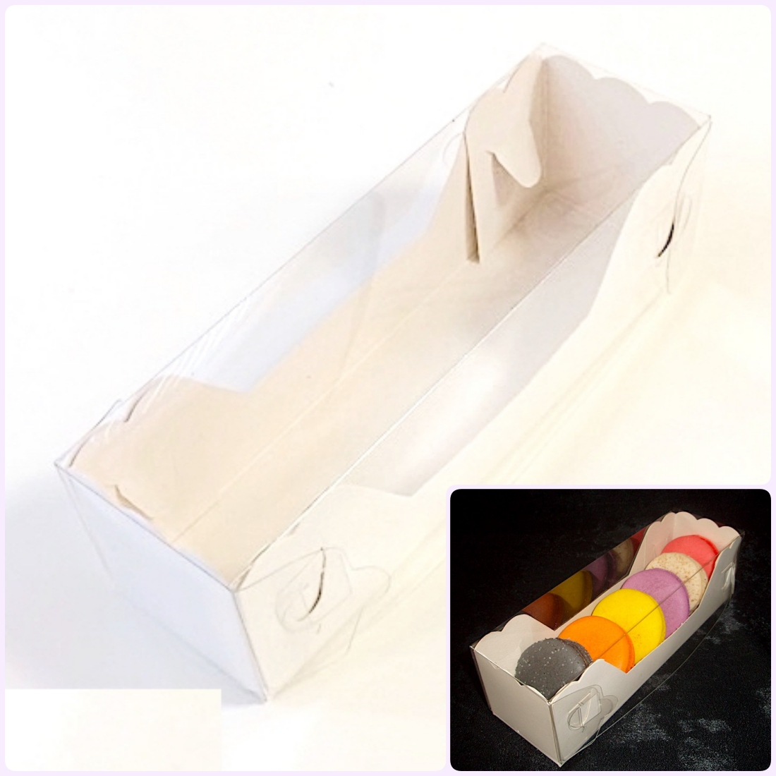 Коробка с прозрачной крышкой 18•6•6 см Белая (крышка+дно) в упаковке 5-25 шт подойдёт для упаковки макарони, шоколада, зефира, пирожных или другой выпечки высотой до 40 мм. Такую коробку для макарони или зефира легко купить в нашем интернет магазине с быстрой доставкой и скидкой. Ищите промокод для скидки у нас на сайте!